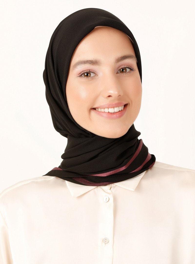 Miray Siyah Gül Kurusu 120 Cm Floş Şifon 3 Çizgili Eşarp