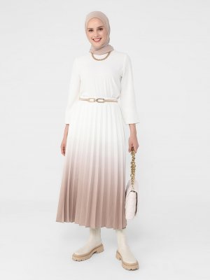 Refka Off White Koyu Bej Degrade Baskılı Piliseli Etek