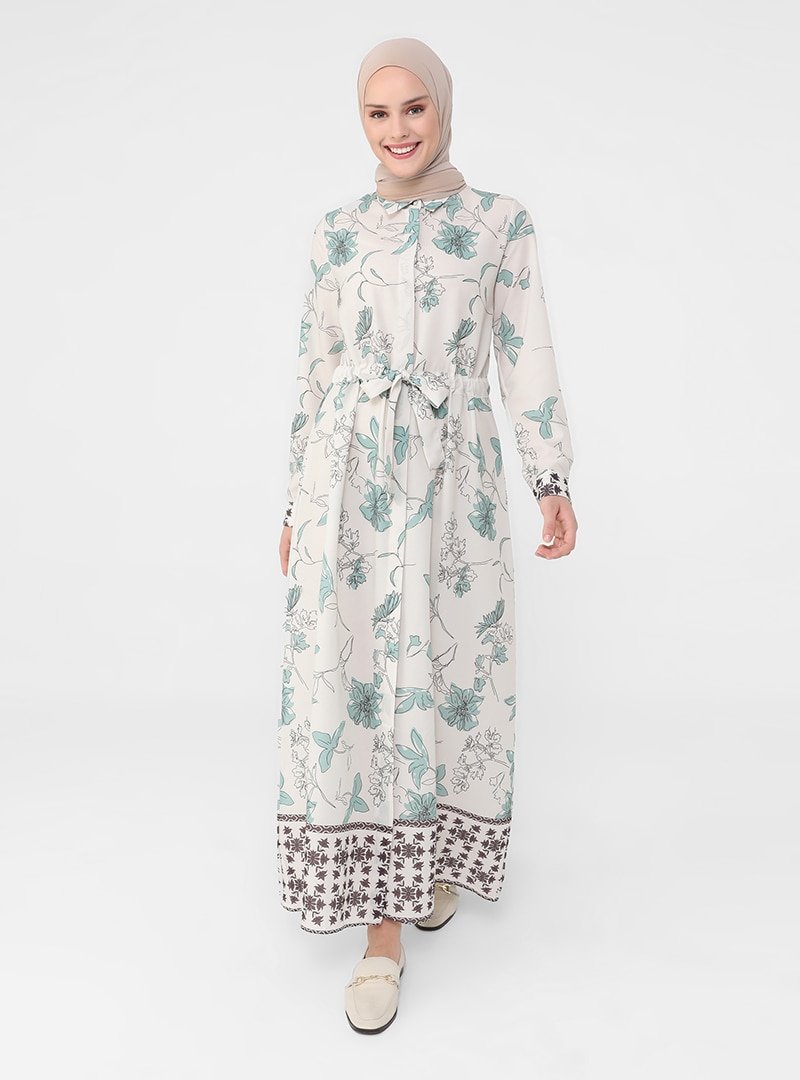 Refka Su Yeşili Gizli Düğmeli Çiçek Desenli Elbise