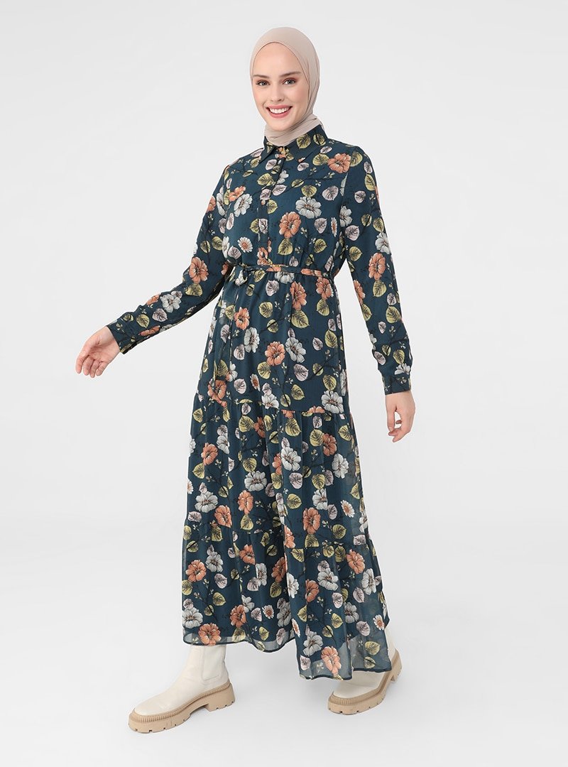 Refka Petrol Astarlı Çiçek Desenli Elbise