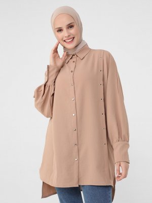 Refka Koyu Bej Düğme Detaylı Arkası Uzun Tunik