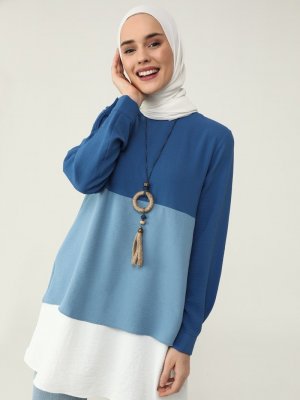 Refka Koyu İndigo Ekru Kolye Detaylı Renk Bloklu Aerobin Tunik