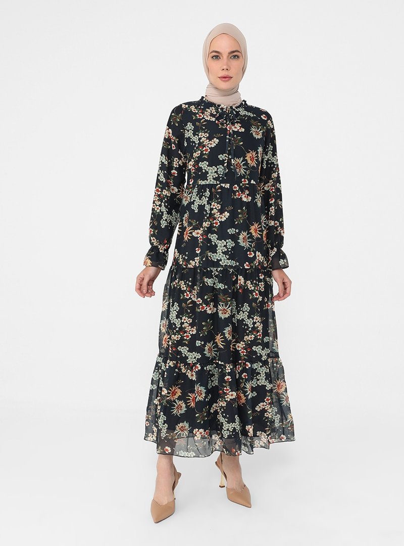 Refka Yeşil Lacivert Yakası Bağlamalı Rahat Kesim Şifon Elbise