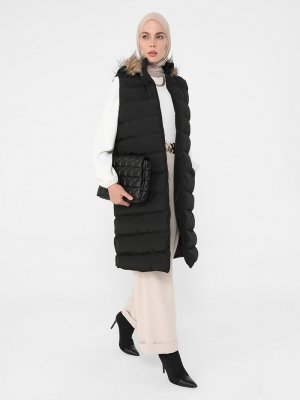 Refka Siyah Kürklü Kapüşonlu Yelek