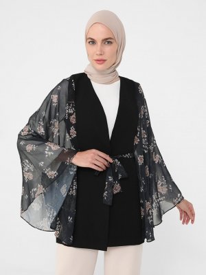 Refka Siyah Şifon Detaylı Yarasa Kollu Ceket