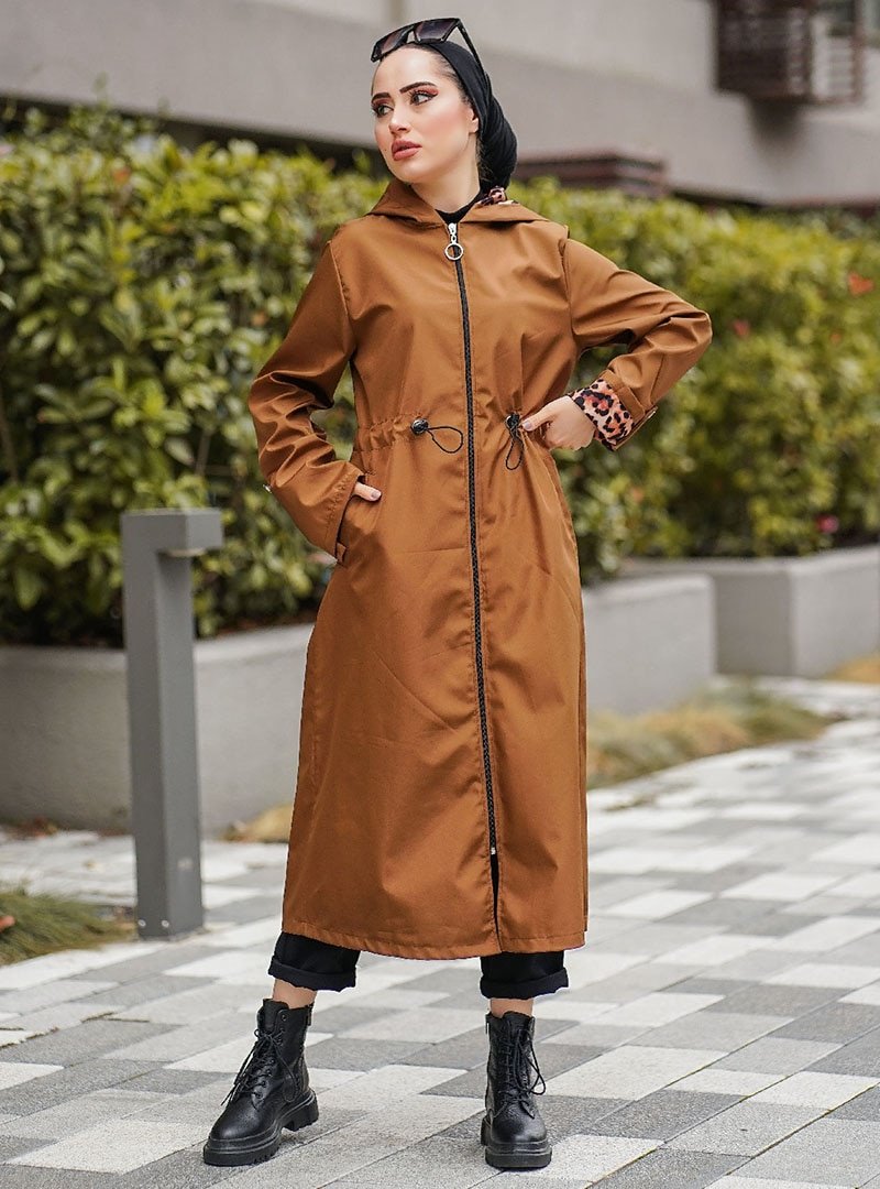 Topless Taba Leopar Detaylı Kapüşonlu Trençkot