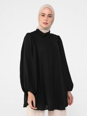 Refka Siyah İpek Tuşeli Volümlü Kol Detaylı Tunik