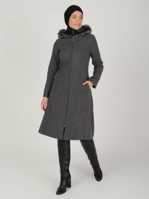 BÜRÜN Gri Kapüşonu Kürk Detaylı Kaban