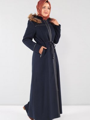 Tesettür Dünyası Lacivert Beli Büzgülü Kaşe Kaban