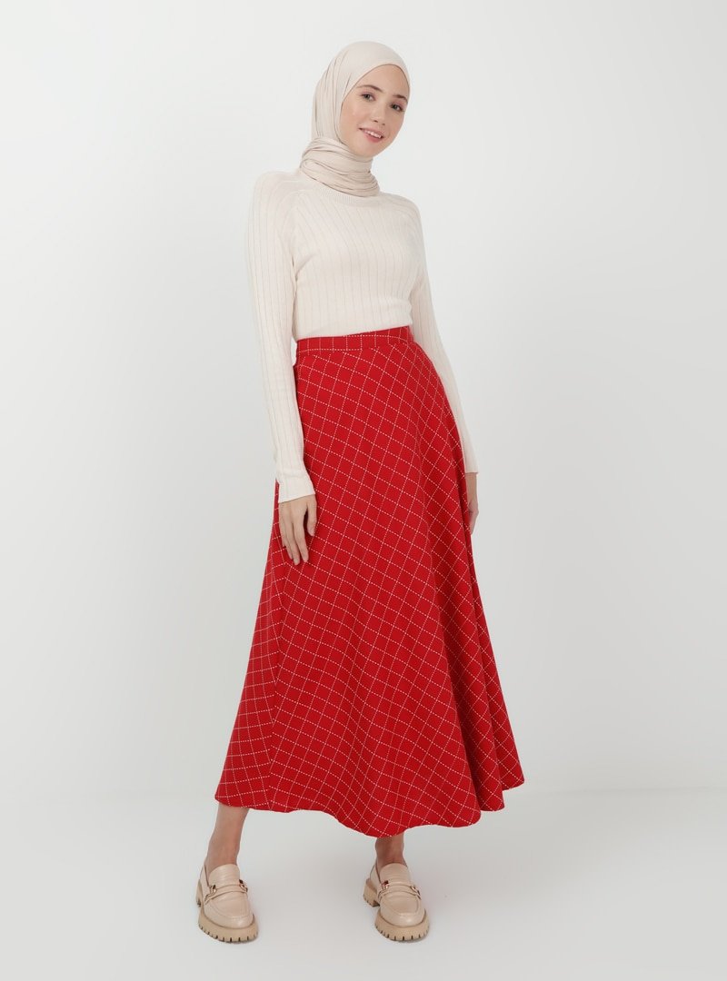 Rabia Karancı Kırmızı Beyaz Kare Desenli Etek