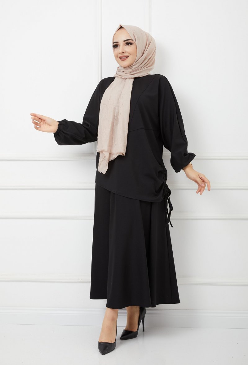 Tuba Mutioğlu Siyah Etek Tunik Tek Tarafı Büzgü Detaylı Takım