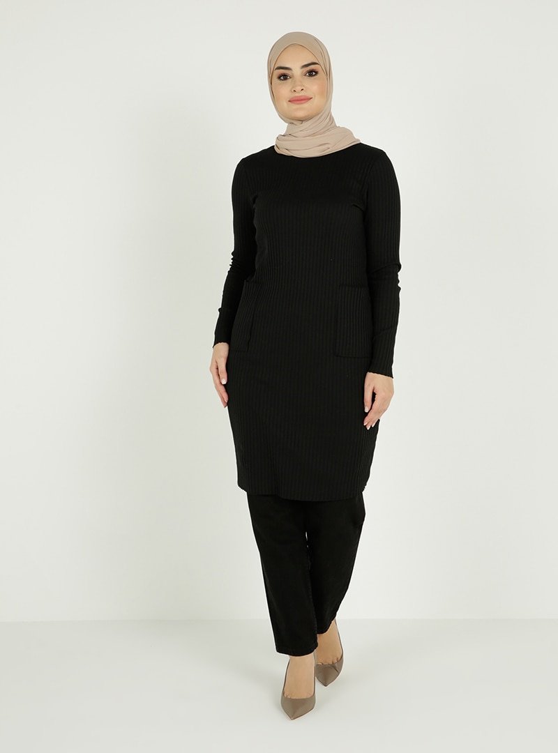 Tavin Siyah Doğal Esnek Kumaş Cep Detaylı Tunik