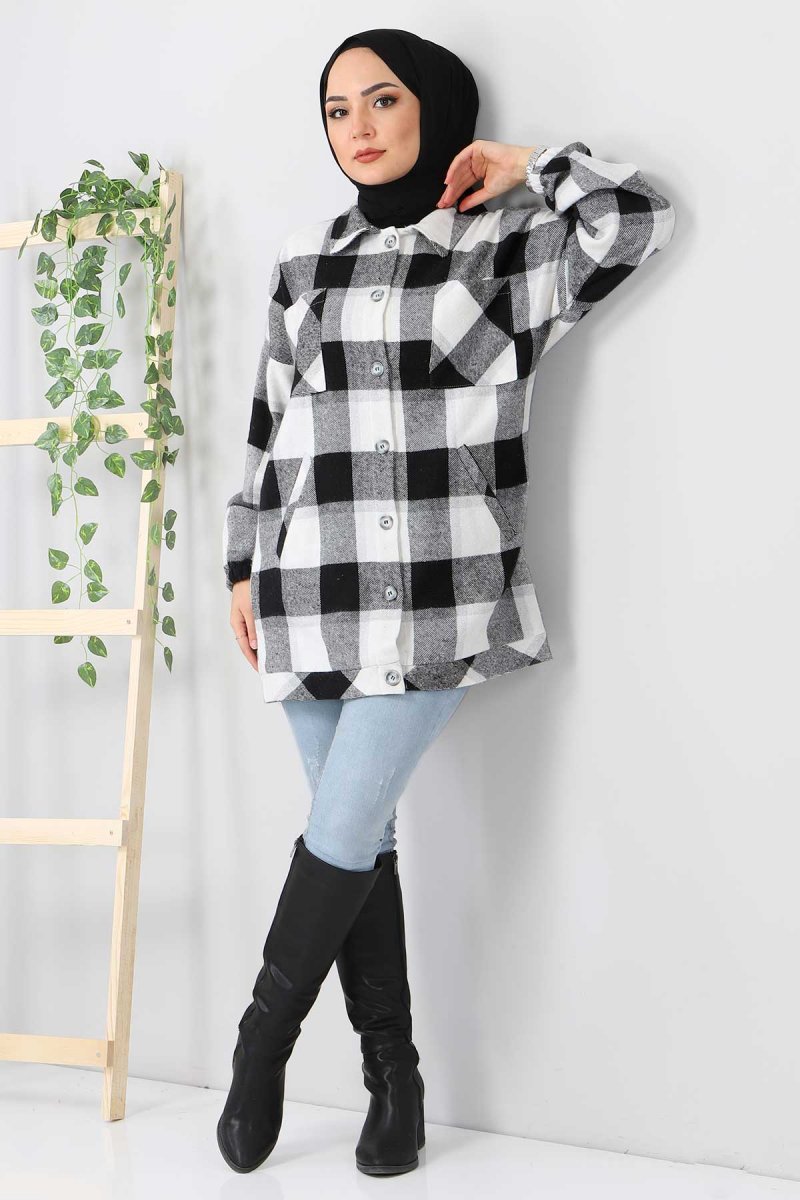 Tesettür Dünyası Siyah Fleto Cepli Ekose Gömlek
