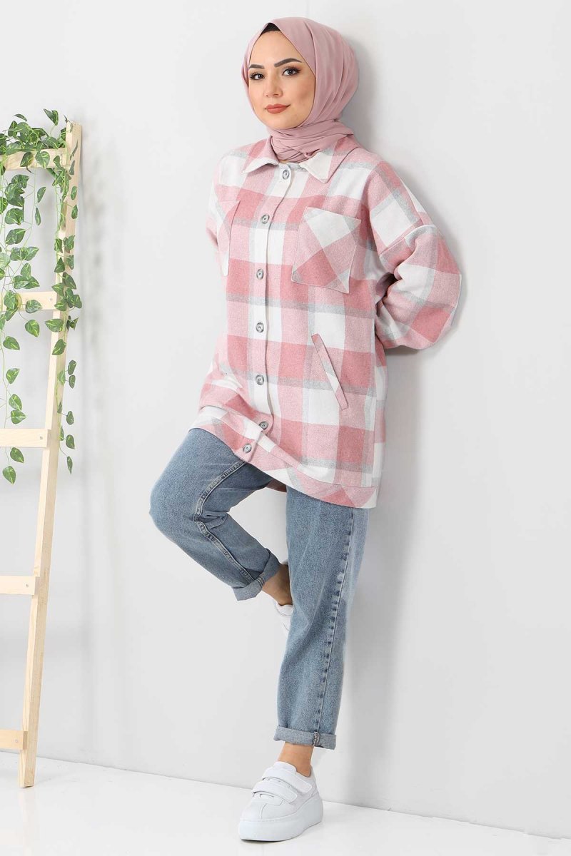 Tesettür Dünyası Pudra Fleto Cepli Ekose Gömlek