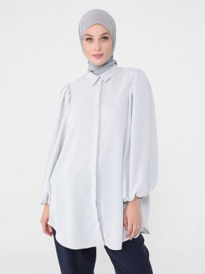 Refka Açık Gri İpek Tuşeli Volümlü Kol Detaylı Tunik