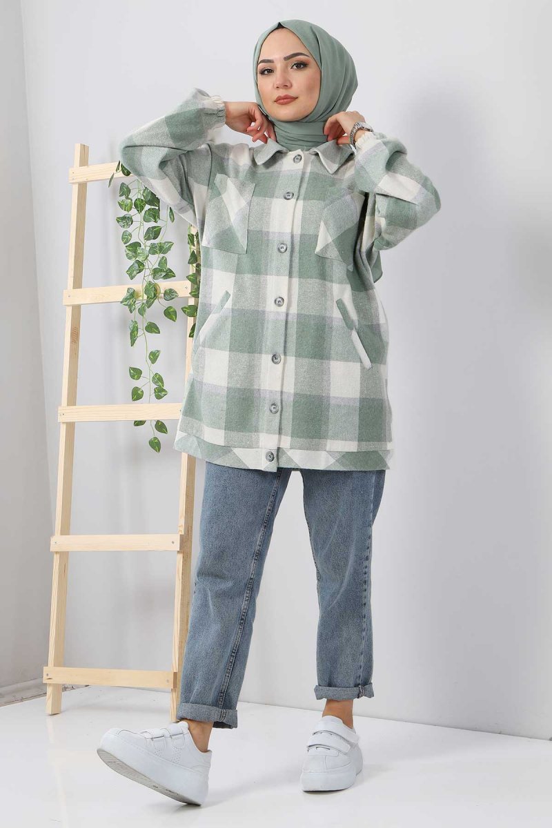 Tesettür Dünyası Mint Fleto Cepli Ekose Gömlek