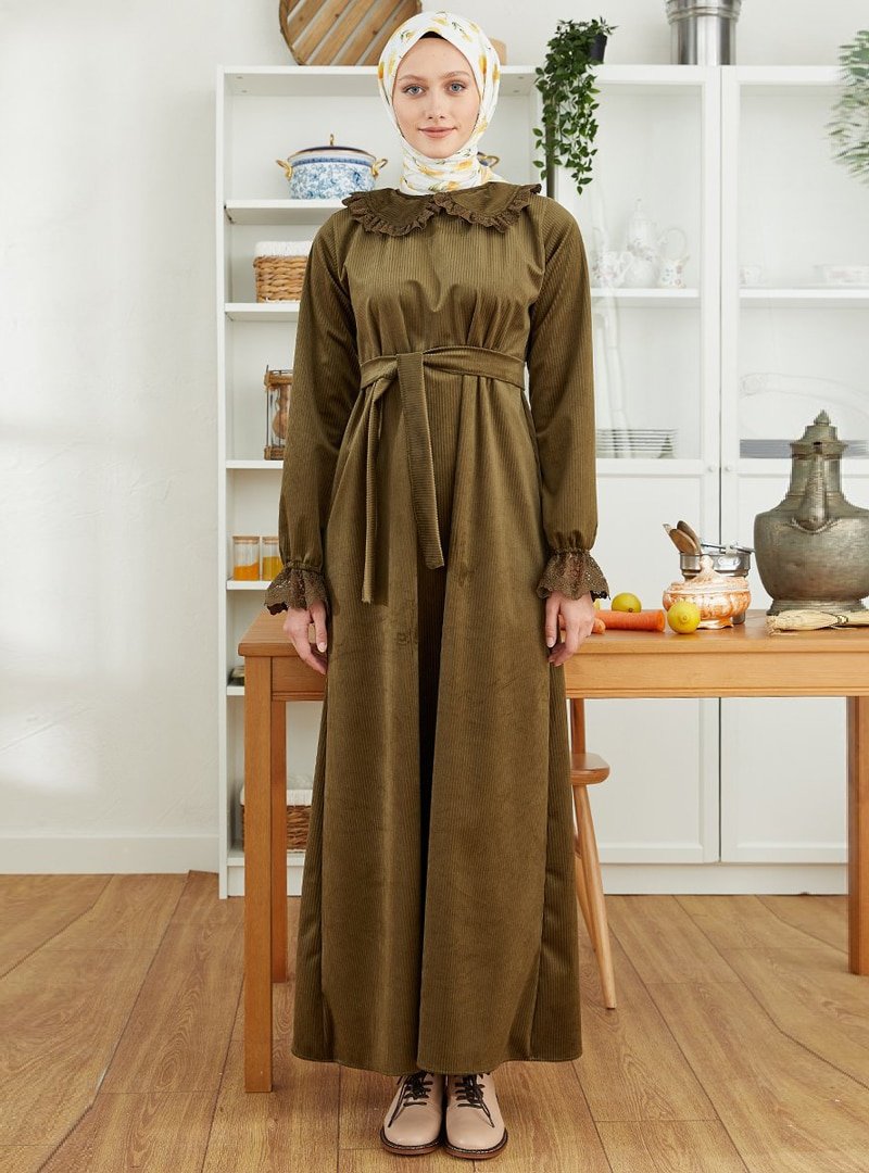 Ceylan Otantik Haki Dantel Detaylı Kadife Bebe Yaka Elbise