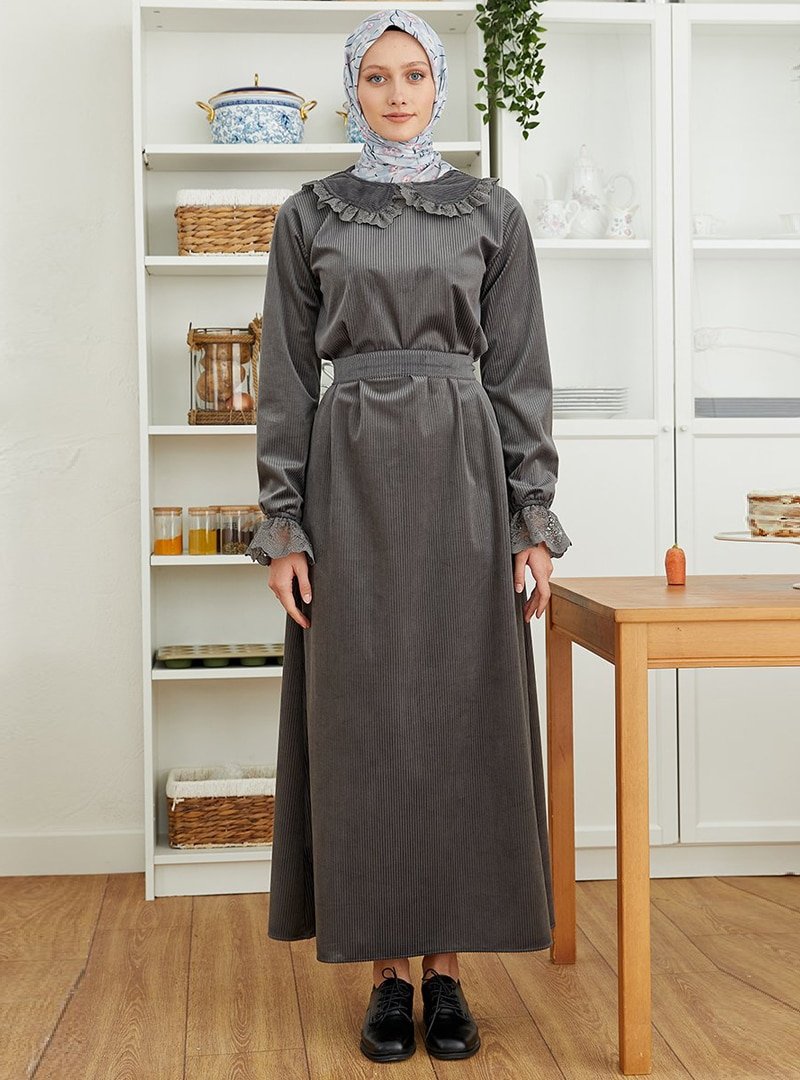 Ceylan Otantik Gri Dantel Detaylı Kadife Bebe Yaka Elbise