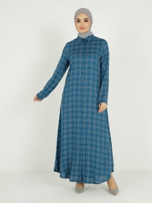 Tavin Mavi Kuşaklı Ekose Desenli Elbise