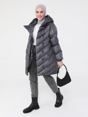 Refka Koyu Gri Kapüşonlu Çıtçıtlı Mont