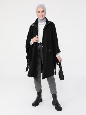 Refka Siyah Çıtçıt Detaylı Fermuarlı Yünlü Panço