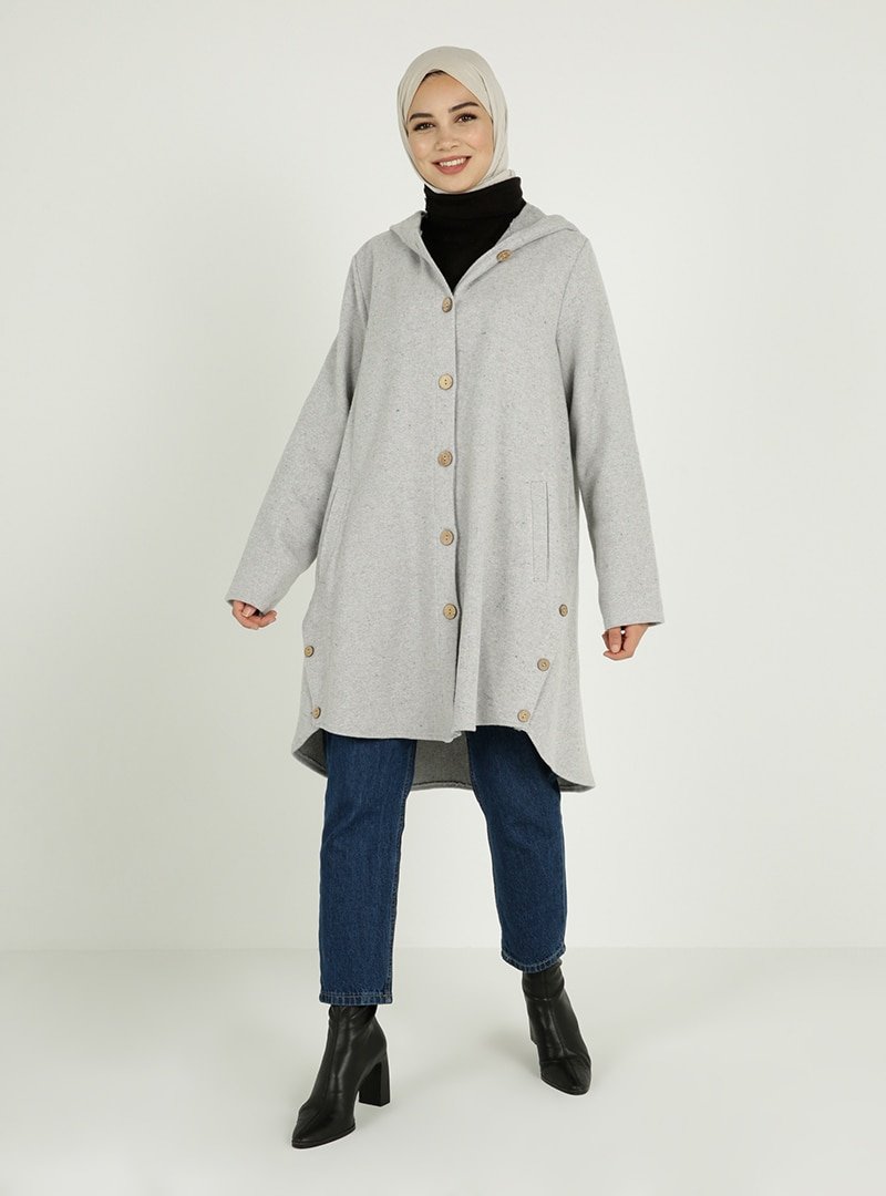 Tavin Gri Düğme Detaylı Kapüşonlu Kaşe Kaban