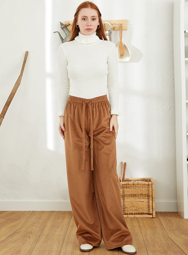 Ceylan Otantik Taba Kadife Bol Paça Pantolon