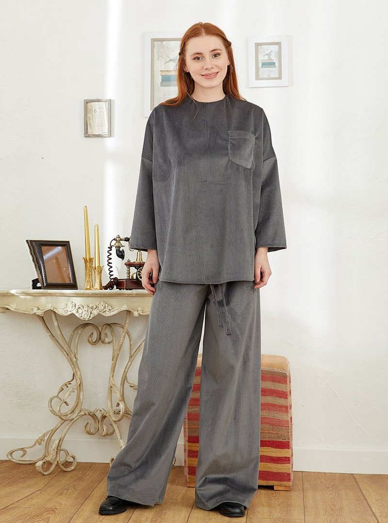 Ceylan Otantik Gri Kadife Bol Paça Pantolon