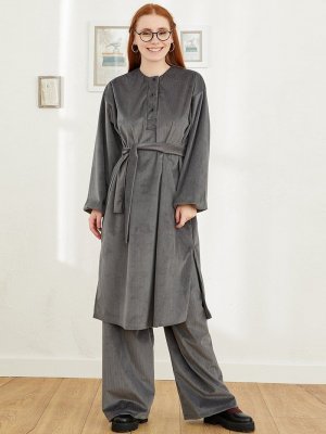 Ceylan Otantik Gri Kadife Tunik & Pantolon Takım