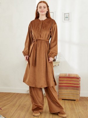 Ceylan Otantik Taba Kadife Tunik & Pantolon Takım