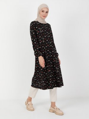 ECESUN Siyah Mavi Çiçek Desenli Tunik