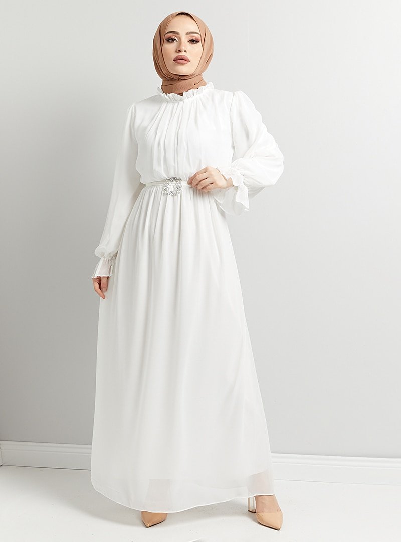 Tuba Mutioğlu Beyaz Astarlı Çıkarıp Takılabilen Seyyar Taş Kemerli Abiye Elbise