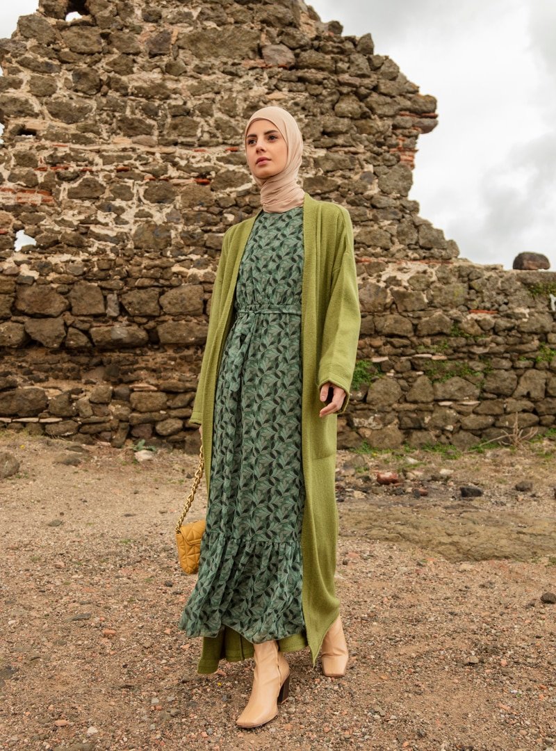 Refka Yeşil Astarlı Kuşak Detaylı Desenli Elbise