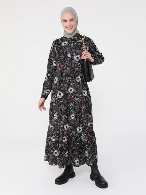 Refka Siyah Sivri Yaka Desenli Elbise