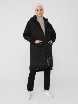 Benin Siyah Çıkarılabilir Kapüşonlu Kaban
