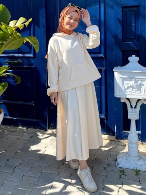 Ceylan Otantik Krem Kapüşonlu Sweatshirt & Etek İkili Takım