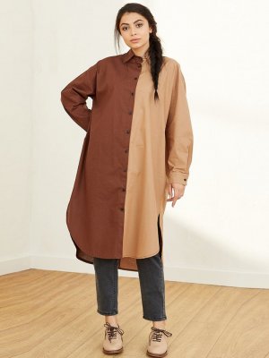 Ceylan Otantik Karamel Kahverengi Çift Renk Kuşaklı Gömlek Tunik