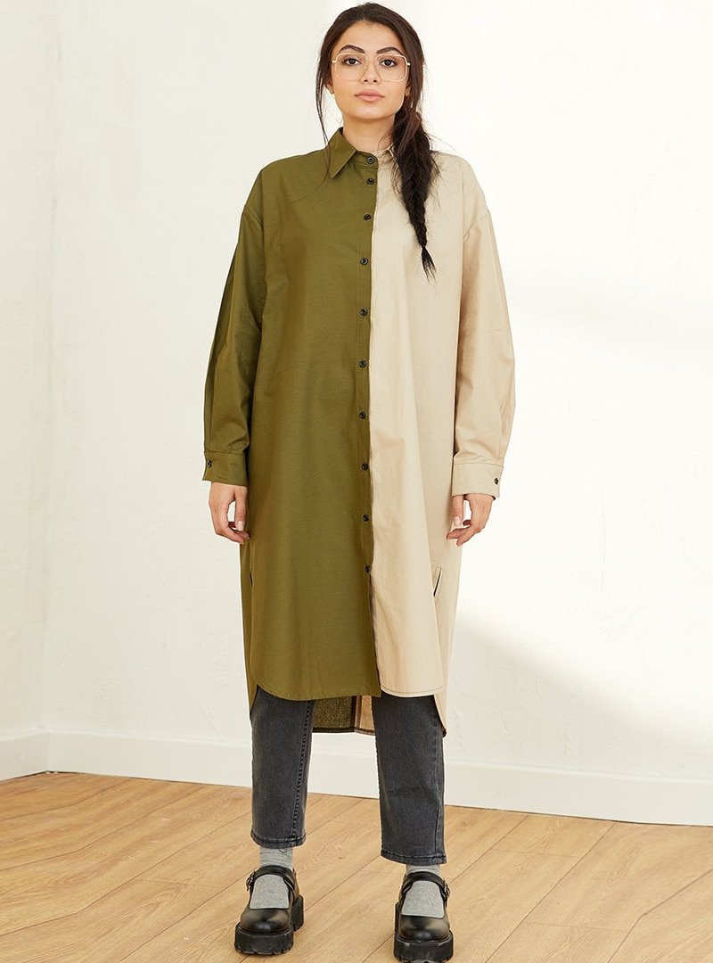 Ceylan Otantik Yeşil Vizon Çift Renk Kuşaklı Gömlek Tunik