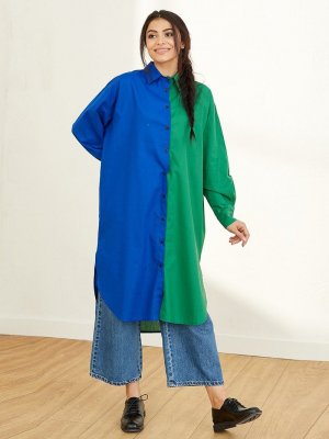 Ceylan Otantik Saks Mavi Yeşil Çift Renk Kuşaklı Gömlek Tunik