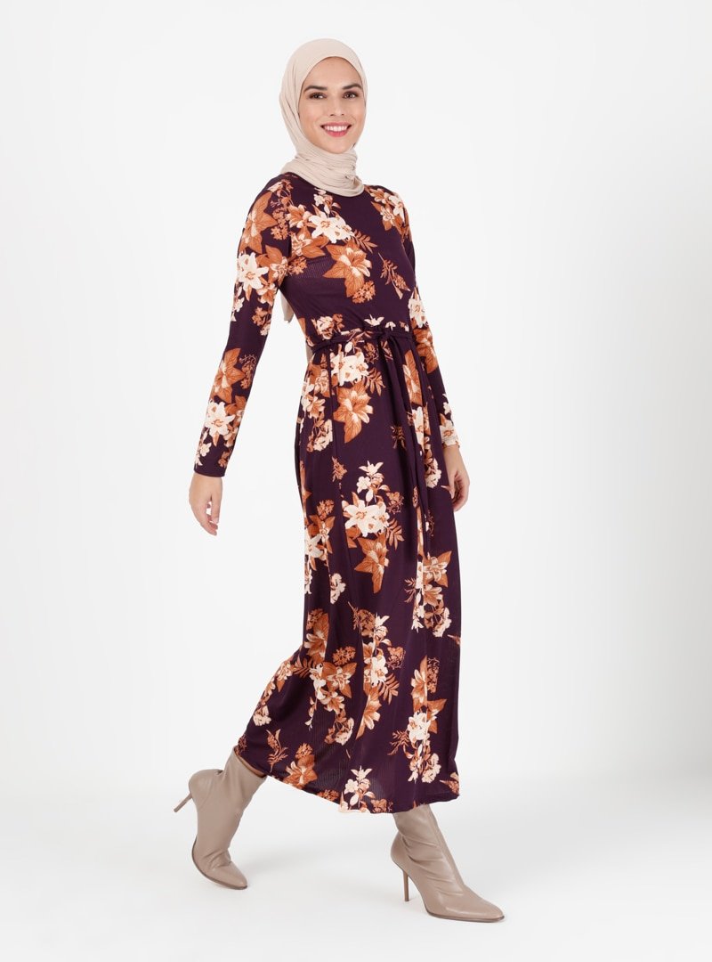 ENSANUR MODA Sarı Mürdüm Desenli Elbise