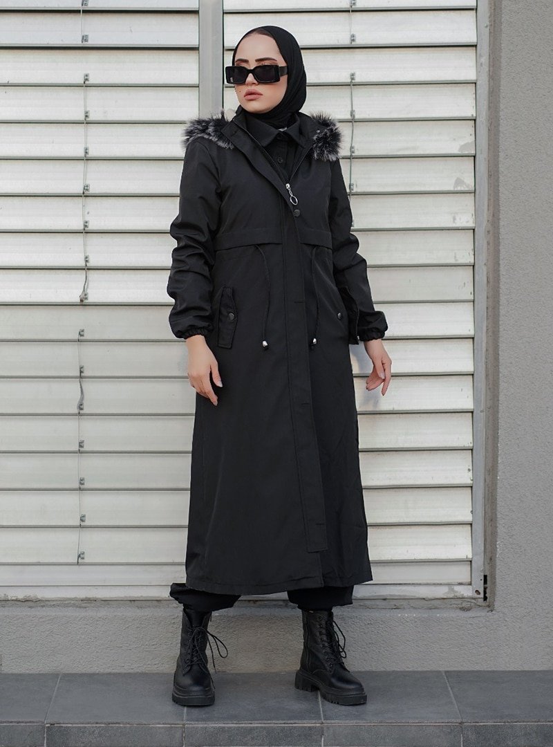 Topless Siyah Kapüşonlu İçi Kürklü Kaban