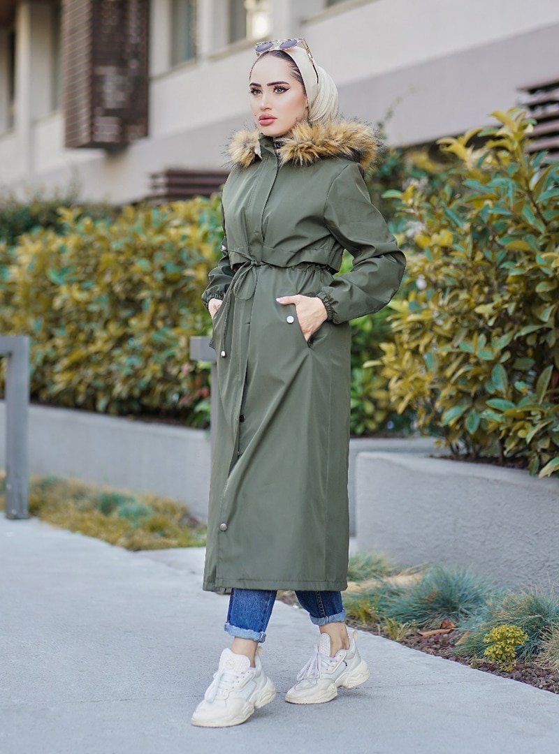 Topless Haki Kapüşonlu İçi Kürklü Kaban