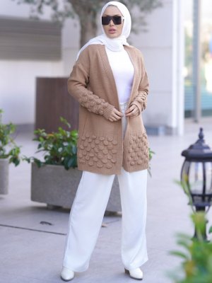 Por La Cara Biskuvi Tek Plaka Etek Ve Kol Uçları Ponpon Detaylı Triko Hırka