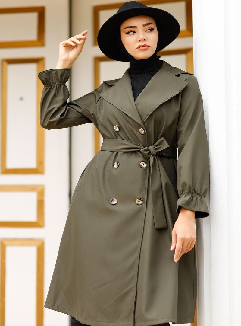 In Style Haki Kol Ağzı Lastikli Düğme Detay Trençkot