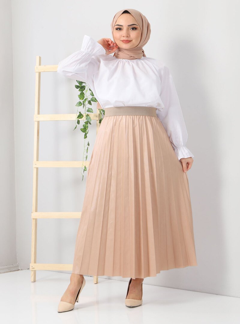 Tesettür Dünyası Bej Deri Görünümlü Etek
