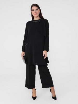 Alia Siyah Büyük Beden Cep Detaylı Volanlı Tunik