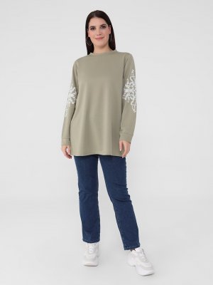 Alia Kekik Bej Büyük Beden Doğal Kumaşlı Kolları Baskılı Tunik