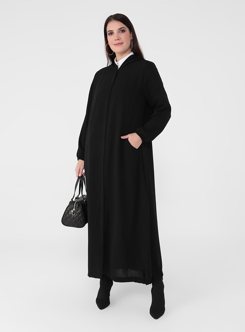 Alia Siyah Büyük Beden Boydan Fermuarlı Kapüşonlu Ferace