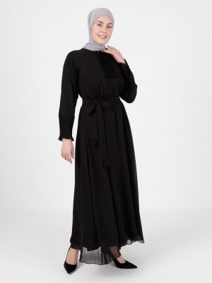 Emsale Siyah Güpür Detaylı Elbise