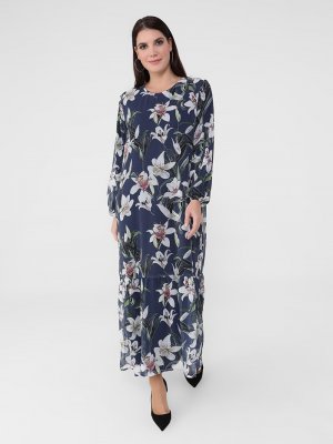 Alia Lacivert Büyük Beden Astarlı Çiçek Desenli Elbise